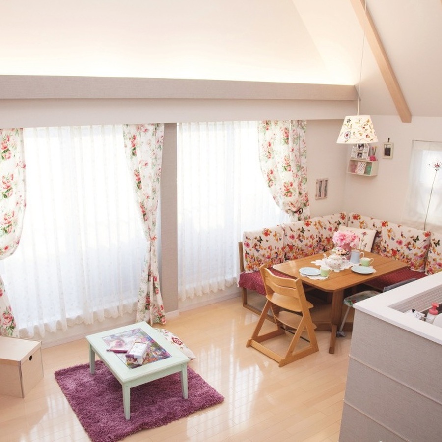 お部屋を優しい雰囲気にしてくれる梁見せ天井 かわいい家 家 リビング ピンク